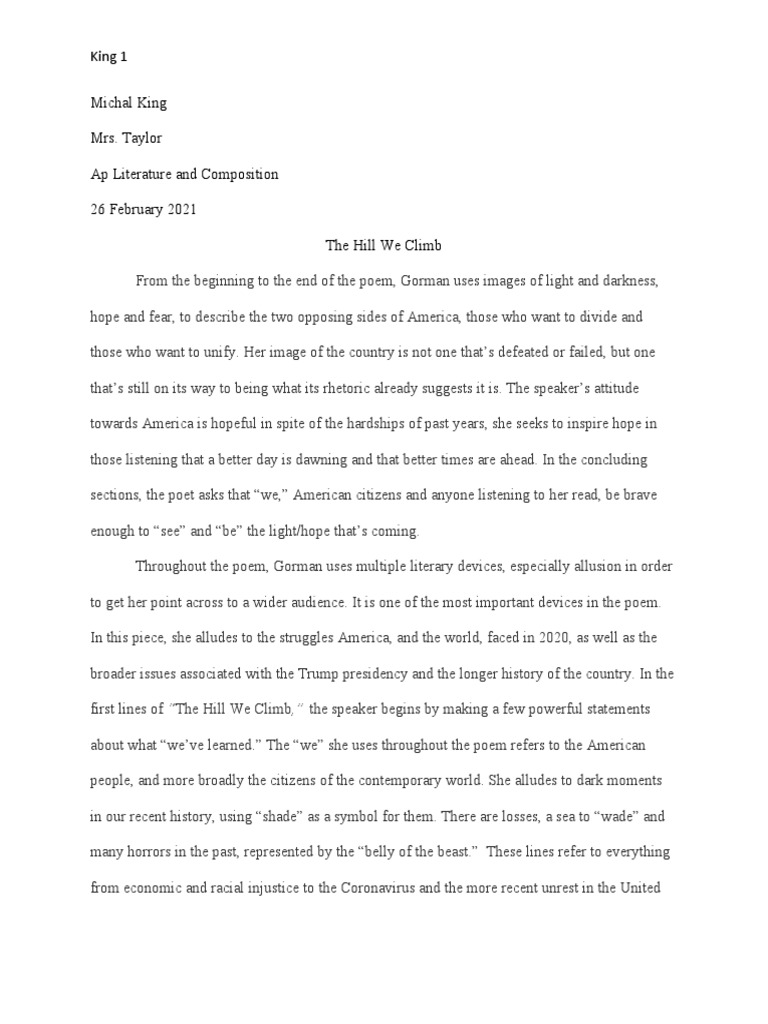 Hill We Climb Essay The Hill We Climb Essay Due To Different Race Beliefs And Social Class There Has Always Been Division In America In The Poem Course Hero